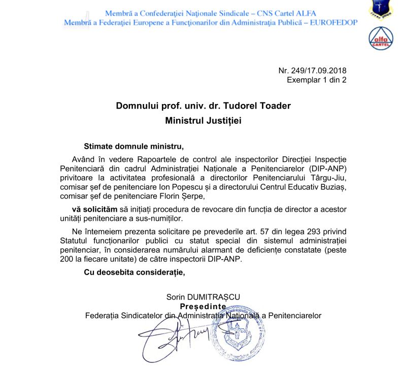 FSANP a cerut, pe 17 septembrie, atât inițierea procedurilor de revocare din funcție a lui Ion Popescu, cât și a unui alt director, mai exact al celui ce conduce Centrul Educativ Buziaș. “Cu un palmares de peste 200 de deficiențe constatate pe cap de director, cei doi “încă” directori, Ion Popescu și Florin Șerpe, într-un stat de drept, condus de NEinfractori, ar fi avut statutul de “civil”. Cum lumea justiției este condusă de o slugă posesoare de o altă slugă mai mică, cei doi comisari șefi (Ion și Florin), ocupă încă scaunele de directori de unități penitenciare. Va trece și vremea slugăreilor, iar la conducerea Ministerului Justiției și a Administrației Naționale a Penitenciarelor vor veni persoane posesoare de coloană