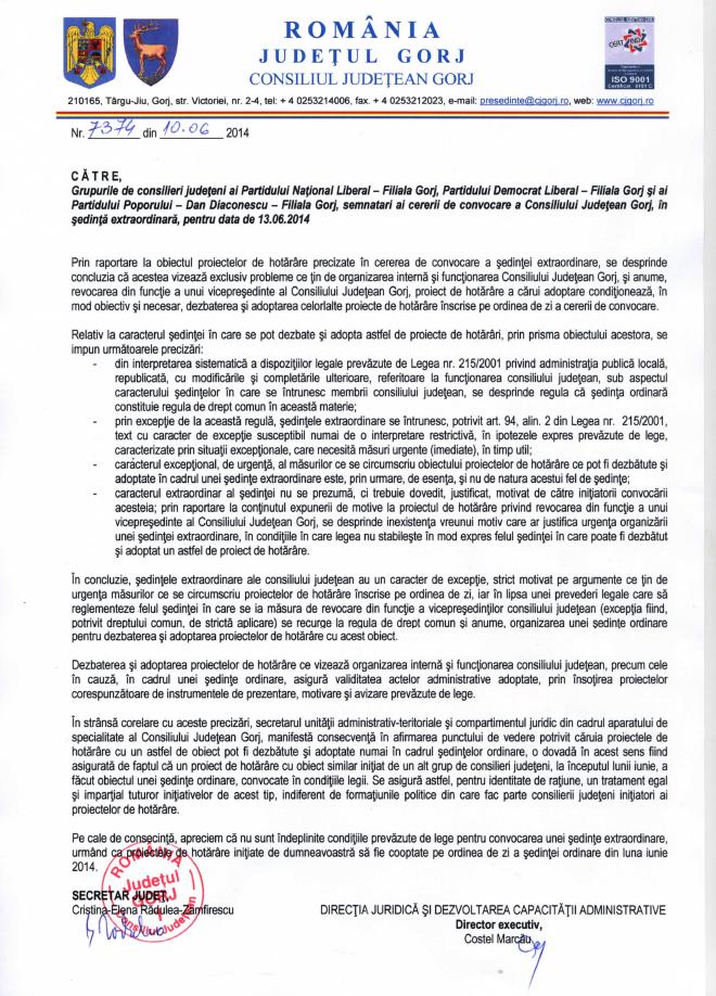 Consiliul Judeţean Gorj a publicat pe site-ul instituţiei un document care atestă faptul că solicitarea consilierilor judeţeni legată de şedinţa extraordinară de vineri nu întruneşte condiţiile legale pentru ca forul judeţean să se întrunească într-o şedinţă cu caracter extraordinar. De altfel, potrivit documentului, atât compartimentul de specialitate juridică şi secretarul judeţului au apreciat că nu sunt îndeplinite condiţiile prevăzute de lege pentru convocarea unei şedinţe extraordinare, urmând ca proiectele de hotărâre iniţiate de solicitanţi să fie cooptate pe ordinea de zi a şedinţei ordinare din luna iunie. Obiectul solicitării lor nu constituie condiţiile legale pentru a se întruni într-o şedinţă cu caracter extraordinar.