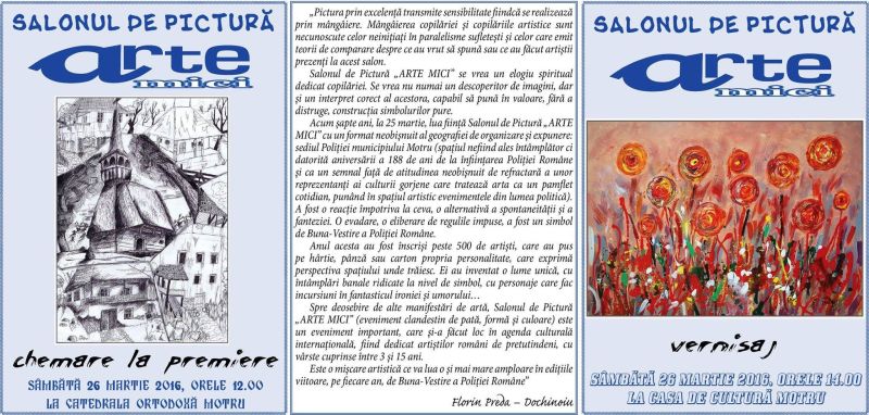SALONUL DE PICTURĂ “ARTE MICI” (eveniment clandestin de formă, pată şi culoare) a fost organizat și în acest an tot de Florin Preda-Dochinoiu, Primăria Municipiului Motru, Casa de Cultură a Municipiului Motru, Uniunea Artiștilor Plastici Motru, Asociația “ȚARA NOASTRĂ, CASA NOASTRĂ”, A.C.S.R.P.P., Cotidianul “Gorjeanul” și Publicația “GAZETA DE MÂINE” (spațiu liber pentru curajul românilor de pretutindeni)”.