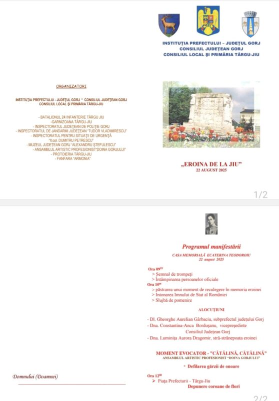 Manifestarea va include o slujbă de pomenire, discursuri din partea autorităților, depuneri de coroane de flori și un moment artistic evocator, intitulat „Cătălină, Cătălină”, susținut de Ansamblul Profesionist „Doina Gorjului”.