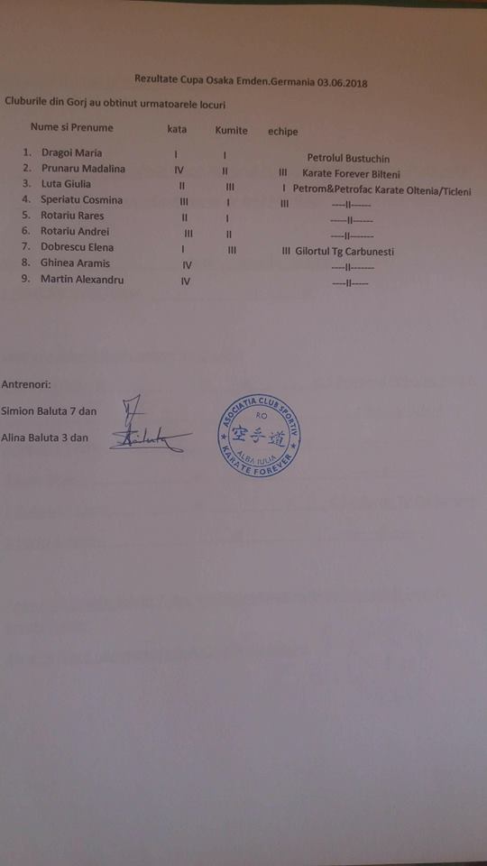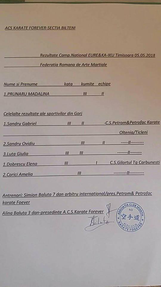 kata, acestea neputând fii repetate. Toți sportivii au fost la înălțime și îi felicit pe această cale”, a declarat antrenorul Simion Băluță 7 dan. Următorul concurs este programat pe 16 iunie 2018 la Slatina, unde se va desfășura Campionatul Național Wuma. În luna iulie, va fi organizat stagiul de pregătire în Eforie Sud, apoi karatiștii vor avea două săptămâni de vacanță, după care se va începe pregătirea în forță pentru Cupa României din toamnă, la Mediaș. Rezultatele obținute de sportivi sunt omologate de MTS și sportivii vor fi premiați la sfârșit de an de către Direcția Județeană de Tineret și Sport Gorj.