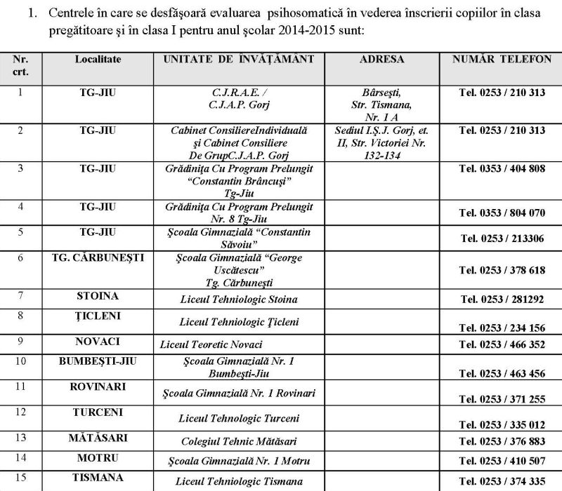 La nivelul judeţului Gorj au fost stabilite 15 centre de evaluare psihosomatică a copiilor ai căror părinţi solicită înscrierea acestora în învăţământul primar. Evaluarea nivelului de dezvoltare psihosomatică a copiilor se va face în perioada 18 februarie – 12 martie, în baza unei programări, iar rezultatul evaluării va fi comunicat în scris părinţilor.
