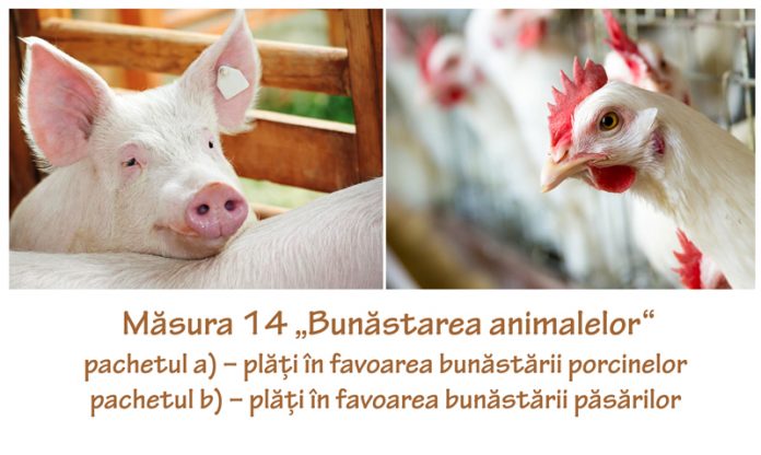 Agenția de Plăți și Intervenție pentru Agricultură (APIA) informează potențialii beneficiari că, până la data de 21 februarie 2021 inclusiv, se depun cererile de plată pentru Măsura 14 „Bunăstarea animalelor” – pachetul a) – plăți în favoarea bunăstării porcinelor și pachetul b) – plăți în favoarea bunăstării păsărilor din cadrul PNDR 2014 – 2020.