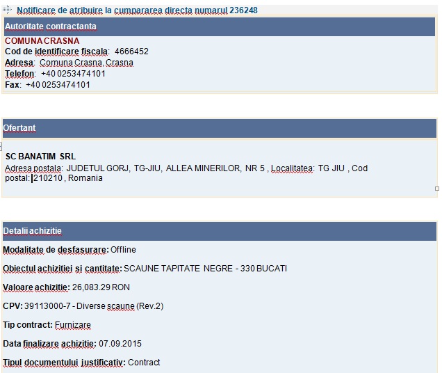 Primul contract parafat, în toamnă, de Vamvu și Puiu Diaconescu a privit achiziționarea de către Primăria Crasna a unor scaune tapițate negre, aflate, culmea, pe stocul magazinului de mobilă din Târgu-Jiu, patronat de familia liberalului. Mai exact, primăria necesită, pe 7 septembrie 2015, tocmai 300 de scaune tapițate negre. Pentru 26.083,92 de lei, Puiu Diaconescu se angajează să aducă obiectele de mobilier primăriei, contractul fiind rapid parafat mai ales că la mijloc era doar o negociere. Primăria, care se mai abonase de mai multe ori, la scaunele lui Puiu Diaconescu, evident că nu face eforturi să găsească vreo ofertă mult mai avantajoasă, chiar dacă în municipiu există numeroase magazine de profil.