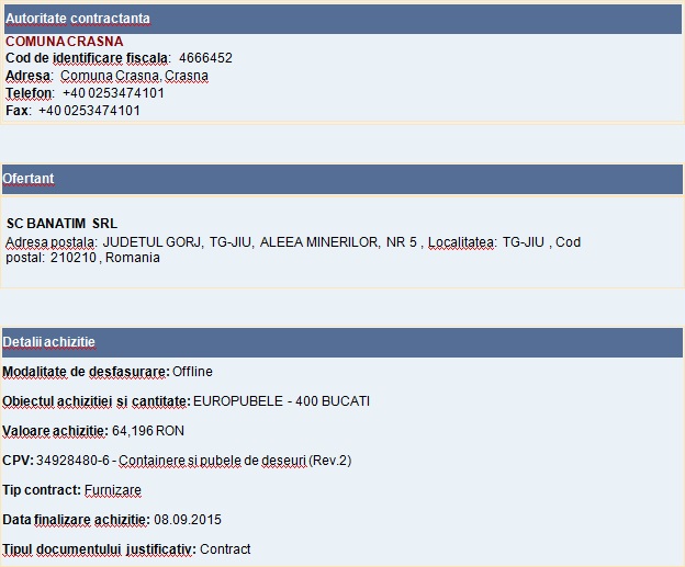 Mai exact, pe 8 septembrie 2015, BANATIM SRL “sare în ajutorul” primarului Vamvu care căuta de zor o firmă apropiată capabilă să aducă până în campanie 400 de europubele în comuna Crasna. Efortul nu este unul gratuit, mai ales că primăria se angajează să plătească bine pubelele de gunoi, Puiu Diaconescu mai alegându-se astfel cu încă 64.196 de lei.