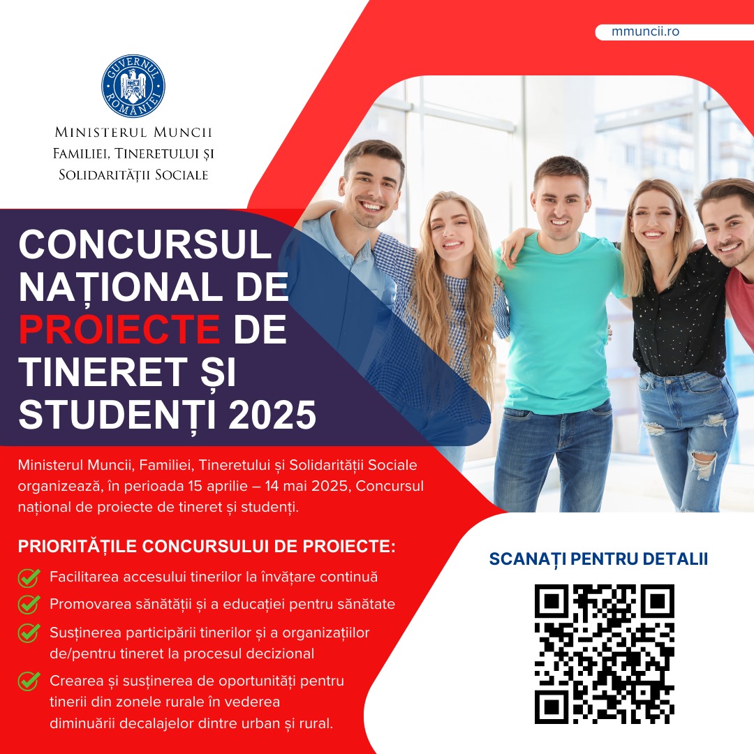 Ministerul Muncii, Familiei, Tineretului şi Solidarităţii Sociale organizează până pe 14 mai 2025, concursul naţional de proiecte de tineret şi studenţi, care beneficiază de finanţări de 3 milioane de lei. Astfel, 1.500.000 lei sunt alocaţi pentru linia de finanţare destinată proiectelor de tineret şi 1.500.000 lei pentru linia de finanţare destinată proiectelor studenţeşti.