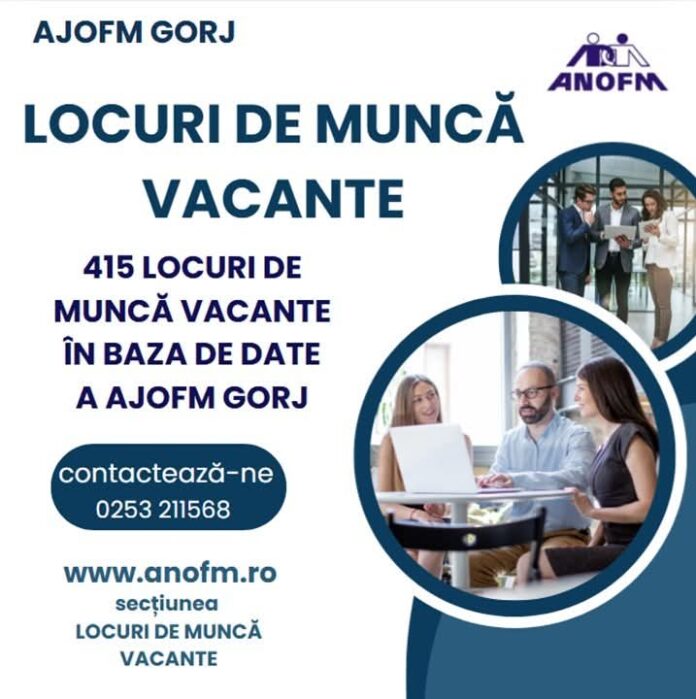 Reprezentanții Agenției Județene pentru Ocuparea Forței de Muncă (AJOFM) Gorj anunță că sunt disponibile 415 locuri de muncă vacante, oferite de angajatori din mai multe domenii de activitate, atât pentru persoane cu studii medii, cât și pentru cele cu studii superioare.