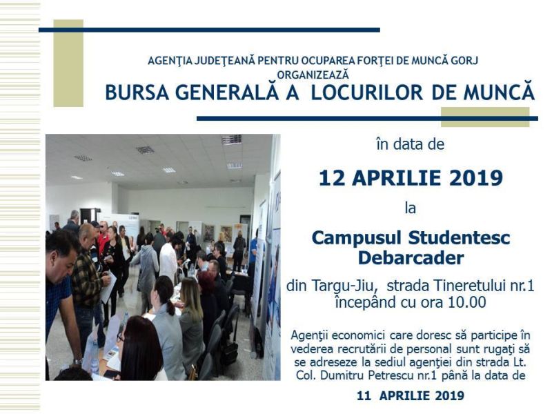 Vineri, 12 aprilie, Agenţia Judeţeană pentru Ocuparea Forţei de Muncă (AJOFM) Gorj organizează Bursa Generală a Locurilor de Muncă.