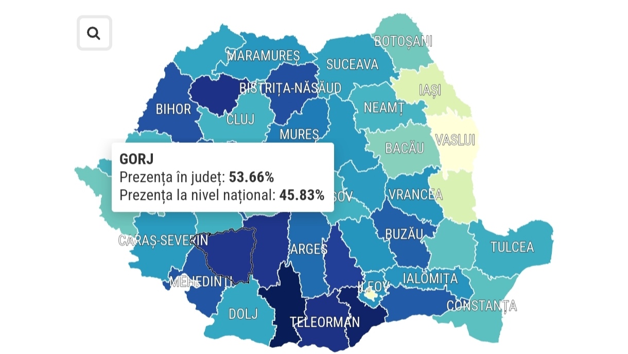 53,66% a fost prezența la vot, înregistrată în județul Gorj, la ora 20:00. La acest moment, Gorjul se află pe locul 5 pe țară privind numărul cetățenilor cu drept de vot care deja și-au exprimat votul.