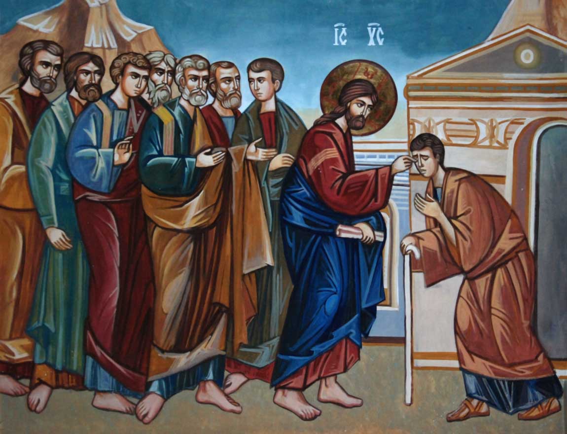 Prin urmare, Mântuitorul se afla în acelaşi Capernaum, înconjurat de oameni dornici să-I asculte cuvântul şi să vadă o faptă minunată, așa cum considerau unii dintre ei, care veneau doar din curiozitate şi gâlceavă. De aceea, supărat pe această mefiență a unora dintre cei care Îl urmau, Mântuitorul spunea că: “Neamul acesta cere semn; dar nu i se va da lui, decât semnul lui Iona proorocul” (Luca 11, 29), când El va şedea cu Trupul Său în mormânt, asemeni proorocului în pântecele chitului. Deci, iată-L pe Mântuitorul ieşind din casa în care tămăduise pe paralitic, iar în urma Sa doi orbi strigau: “Miluieşte-ne pe noi, Fiul lui David” (Matei 9, 27). Nici nu ştim dacă cei doi infirmi erau orbi din naştere sau aveau acest handicap de pe parcursul vieţii, dar ceea ce ştim şi afirmăm cu certitudine este că cei doi orbi se apropiau de Mântuitorul cu ochii inimii, deschişi şi luminaţi de credinţă, pentru că în timp ce majoritatea semenilor lor vedeau fizic, cu ochii sufletului rămâneau orbiţi datorită necredinţei şi împietririi inimii lor. De aceea, supărat pe orbirea spirituală a celor care în zadar cereau semne şi minuni, Mântuitorul le reproşa: “De n-aţi fi văzut minunile pe care le-am făcut, păcat nu aţi avea. Dar acum nu (mai puteţi să) aveţi cuvânt de apărare”. Dar, cât de semnificativ și de interesant ne apare acest contrast! Oare, de unde ştiau aceşti orbi că Mântuitorul este Fiul lui David sau Mesia? Desigur, auziseră şi ei că Mântuitorul Hristos redase vederea altor orbi, tămăduise surzi, îndrăciţi, leproşi şi chiar înviase din morţi, iar astfel de lucruri minunate nu puteau fi săvârşite decât de cineva cu o putere dumnezeiască. Dacă în Vechiul Testament, profeţii cereau lui Dumnezeu fapte minunate pentru cei neputincioşi, Mântuitorul este Cel Care lucrează cu propria Sa îndumnezeită putere. Şi acest adevăr este destul de limpede observat chiar şi pentru aceşti doi orbi, care înţeleg că numai prin venirea lor la Hristos, vor putea vedea cu adevărat. Aşadar, cei doi orbi se apropie de Mântuitorul cu ochii inimii deschişi, şi aşa încep a striga către Dânsul, cerându-I milă: “Iisuse, Fiul lui David, miluieşte-ne!” (Matei 9, 27), ca apoi să asistăm la un scurt dialog între Mântuitorul şi cei doi orbi: “Credeţi că pot să fac aceasta”(să vă redau vederea fizică)?, îi întreabă Mântuitorul. “Da, Doamne”, I-au răspuns ei! Atunci, El S-a atins de ochii lor şi a zis: “După credinţa voastră, fie vouă!” (Matei 9, 28-29). Şi Sfântul Apostol şi Evanghelist Matei, ne spune cum îndată credinţa lor s-a verificat, pentru că “S-au deschis ochii lor” şi au început să vadă (Matei 9, 30). Era un fel de verificare a credinţei ce-o aveau, pentru că de n-ar fi crezut, ochii lor nu s-ar fi deschis.