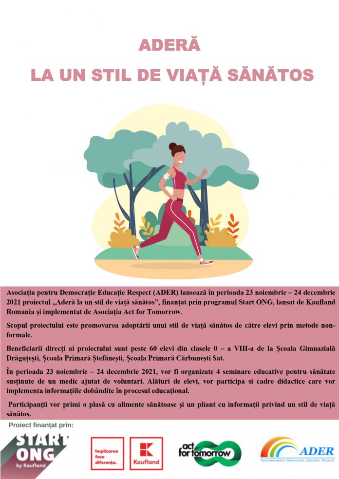Asociația pentru Democrație Educație Respect (ADER) lansează în perioada 23 noiembrie – 24 decembrie 2021 proiectul „Aderă la un stil de viață sănătos”, finanțat prin programul Start ONG, lansat de Kaufland Romania și implementat de Asociația Act for Tomorrow. Scopul proiectului este promovarea adoptării unui stil de viață sănătos de către elevi prin metode non-formale, iar beneficiarii direcți ai proiectului sunt minim 60 elevi din clasele 0 – a VIII-a de la școli din județul Gorj.