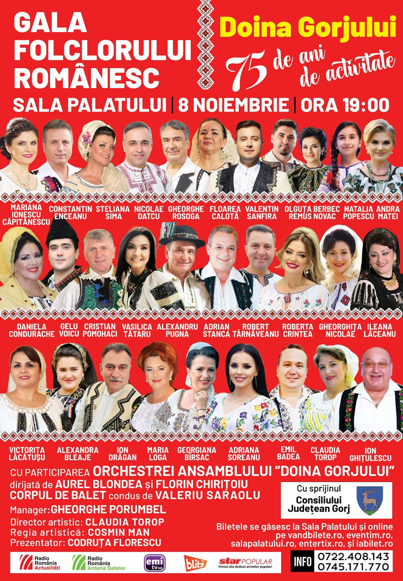 Mai mulți artiști gorjeni, dar și colegi de scenă de-ai acestora din întreaga țară, se vor reuni sub cupola unui spectacol excepțional. Mai precis, pe 8 noiembrie, de la ora 19:00, va avea loc Gala Folclorului Românesc, un eveniment de celebrare a 75 de ani de activitate pentru Ansamblul ,,Doina Gorjului” de la Târgu-Jiu, ce este programat să aibă loc chiar în capitala țării, la Sala Palatului. Scena va deveni neîncăpătoare pentru următorii artiști care vor oferi un adevărat regal folcloric: Constantin Enceanu, Mariana Ionescu Căpitanescu, Steliana Sima, Floarea Calotă, Daniela Condurache, Valentin Sanfira, Gheorghe Roșoga, Natalia Popescu, Gelu Voicu, Vasilica Tătaru, Alexandru Pugna, Nicolae Datcu, Gheorghița Nicolae, Adrian Stanca, Robert Târnăveanu, Cristian Pomohaci, Emil Badea, precum și marii soliști ai Ansamblui ,,Doina Gorjului” – Olguța Berbec, Andra Matei, Roberta Crintea, Ileana Lăceanu, Alexandra Bleaje, Victorița Lăcătușu, Ion Drăgan, Georgiana Bîrsan, Adriana Soreanu, Claudia Torop, Maria Loga și Ion Ghițulescu. Ansamblu Folcloric Profesionist ,,Doina Gorjului”, ajuns la venerabila vârstă de 75 de ani este una dintre cele mai importante instituții de folclor din România, fiind de foarte mulți ani un ambasador al Gorjului în țară și peste hotare. Reperele sale istorice au cifre rotunde în acest an, 75 de ani de la apariția ,,Taraful Gorjului” și 55 de ani de la schimbarea numelui în ,,Doina Gorjului. Biletele se găsesc la Sala Palatului și online pe: vandbilete.ro, entertix.ro, eventim.ro, iabilet.ro si salapalatului.ro.