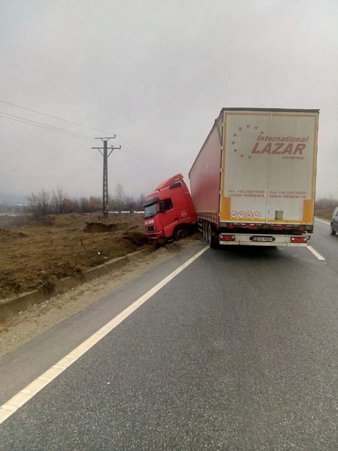 Un șofer de tir a ajuns, ieri după-amiază, cu mașina în șanț, în timp ce circula pe Drumul Național 66, înspre Bumbești Jiu. În zona Castrului Roman acesta s-a speriat de apariția unui echipaj al Poliției Rutiere și a dat în frâne pentru a reduce viteza cu care circula. Mașina a intrat însă în derapaj și a fost scăpată de sub control. Șoferul nu a pățit nimic, dar a reușit să blocheze circulația pe un sens de mers, traficul desfășurându-se alternativ până când tirul a fost tractat și scos din șanț. Zona în care s-a produs incidentul este o porțiune de drum drept, recent modernizată, pe care, de regulă, șoferii circulă cu viteză, mai ales că este în extravilan.