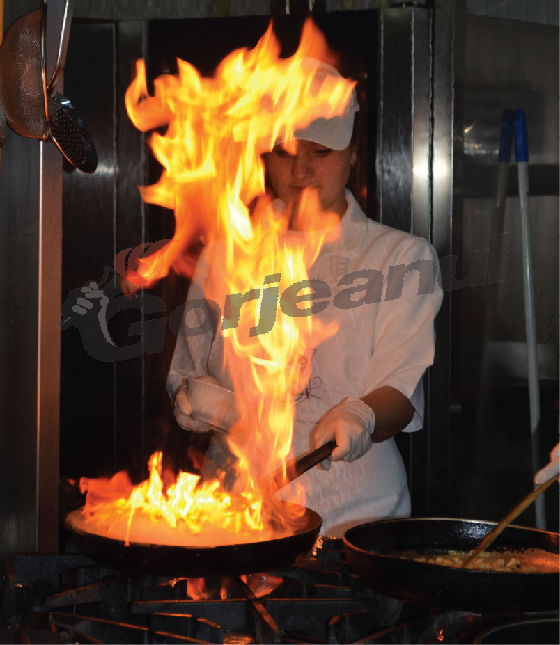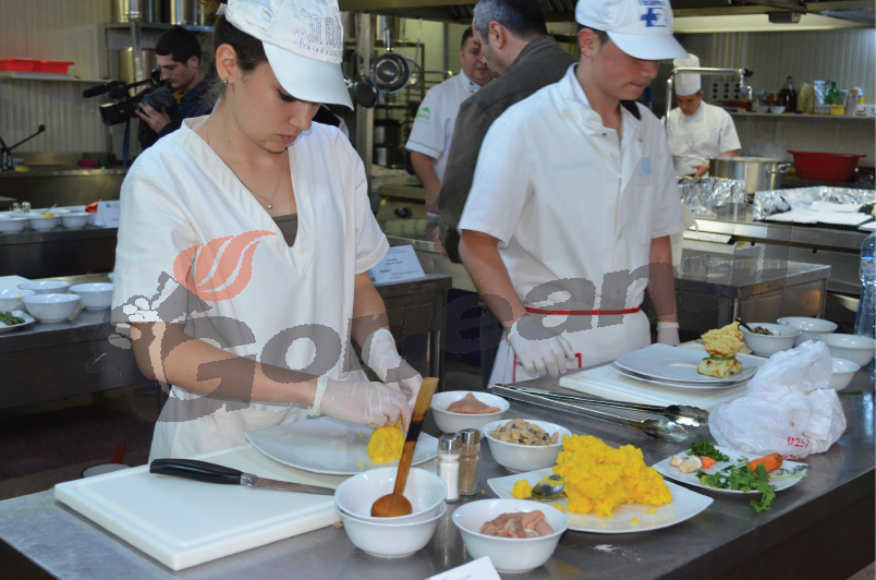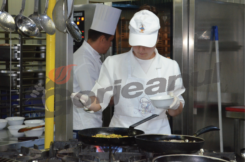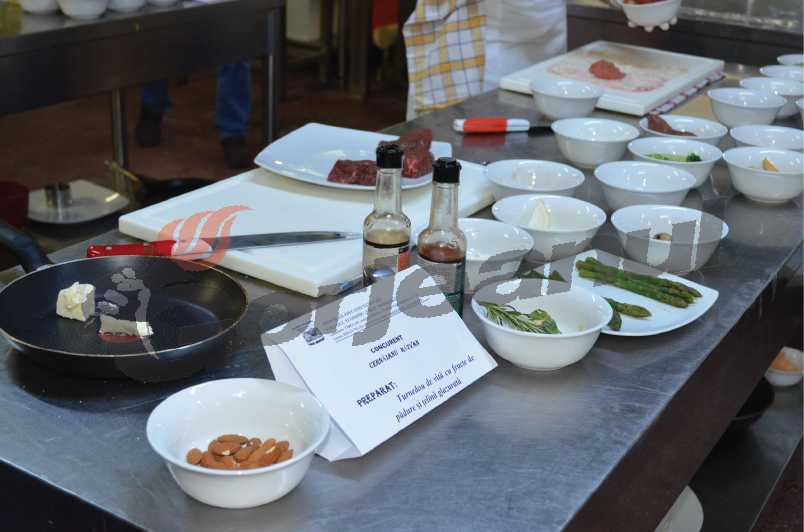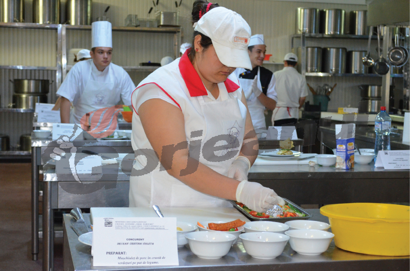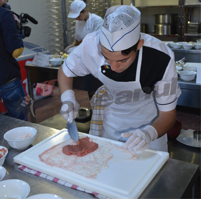 Muşchiuleţ de porc în crustă de verdeţuri pe pat de legume, turnedou gratinat cu legume julien, muşchi de vită cu zucchini pe pat de ciuperci şi sos de vişine, beef Wellington cu cartofi Hasselback şi sos de vin roşu, muşchi de porc cu struguri şi migdale, piept de pui cu coşuleţe de primăvară – acestea sunt doar câteva dintre preparatele cu care cei zece elevi care au participat joi la finala concursului de gătit “Ucenic Chef”, organizat de Colegiul Economic “Virgil Madgearu” din Târgu-Jiu, au încercat să-i impresioneze pe membrii juriului, sperând să-şi adjudece astfel titlul de “Ucenic Chef”. “Este finala celei de-a doua ediţii a concursului «Ucenic Chef». Ne bucurăm foarte mult că a avut loc şi ne bucurăm în primul rând de susţinerea agentului economic, adică SC Crescendo SRL. Participă un număr de zece elevi, dintre care opt sunt de la Colegiul Economic «Virgil Madgearu» şi doi de la licee din judeţ. Şi-au ales preparate destul de complicate, zic eu”, a declarat Narcisa Călugăru, coordonatorul concursului. Născută din dorinţa elevilor de a-şi demonstra talentele culinare, această competiţie a oferit deja unui tânăr posibilitatea de a vedea dacă o carieră de bucătar este sau nu ceea ce îşi doreşte cu adevărat. Este vorba de Daniel Nicu, câştigătorul de anul trecut al concursului “Ucenic Chef”, care a asistat ieri la prepararea mâncărurilor.
