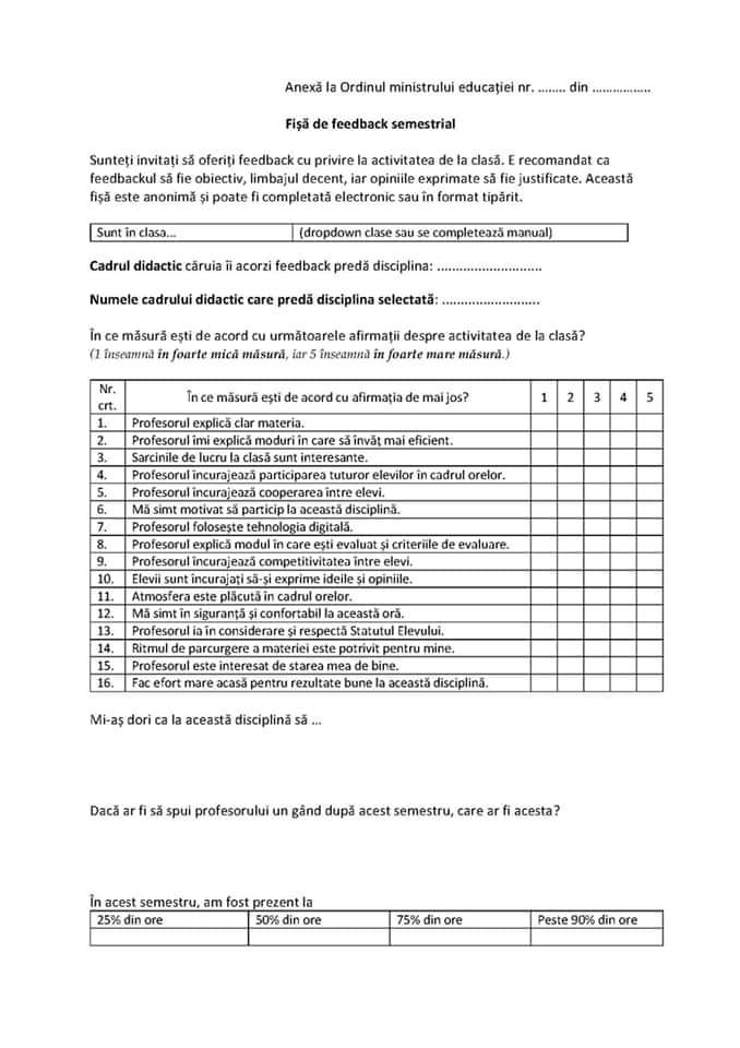Ministerul Educației a anunțat că a definitivat Metodologia de acordare a feedbackului privind activitatea de învățare, predare și evaluare în învățământul preuniversitar. „Încrederea este o valoare esențială, care definește respectul reciproc și interdependența între toți actorii implicați în educație, în special între elev și profesor. Între părți trebuie să existe relații constructive îndreptate spre atingerea misiunii școlii, aceea de a-i pregăti pe copii și tineri pentru o viață independentă, de modelare a lor în adulți responsabili. Ministerul Educației a definitivat Metodologia prin care profesorilor li se dă posibilitatea de a consulta, în mod sistematic și constructiv, elevii, cu privire la modul în care aceștia percep beneficiile educației. Elevilor li se dă șansa să reflecteze în mod regulat asupra modului în care școală îi ajuta să se dezvolte, să crească. Este foarte important ca elevii să fie parte a tuturor aspectelor învățării, iar oferirea de feedback constructiv este o abilitate care sprijină adultul independent în organizarea relațiilor de familie, de muncă sau sociale”, a anunțat Ministerul Educației.
