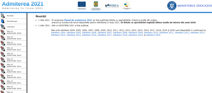 A fost publicat site-ul dedicat admiterii la liceu pentru anul școlar 2021-2022. La adresa http://admitere.edu.ro, viitorii liceeni și părinții acestora pot consulta informații legate de specializările, liceele şi şcolile din fiecare județ, precum şi numărul de locuri disponibile. În listele cu specializări se regăsește și ultima medie de intrare din anul 2020.