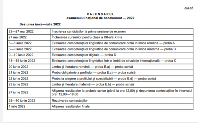 Calendarul examenului de bacalaureat a fost publicat în Monitorul Oficial. Potrivit documentului, în sesiunea iunie-iulie, probele de evaluare a competențelor se vor desfășura în perioada 6 – 15 iunie, iar probele scrise se vor desfășura în perioada 20 – 23 iunie. Primele rezultate se vor afișa pe 27 iunie, iar cele finale pe 1 iulie. Pentru sesiunea august-septembrie, prima probă scrisă este programată pe 16 august.