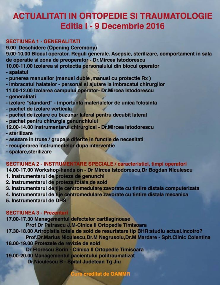Facultatea de Științe Medicale și Comportamentale din cadrul Universității „Constantin Brâncuși” (UCB) din Târgu-Jiu, în colaborare cu Medical Ortovit, Spitalul Județean de Urgență Târgu-Jiu, Asociația pentru Dezvoltarea Ortopediei Gorjene, Colegiul Medicilor Gorj și Ordinul Asistenților Medicali Gorj, organizează astăzi, 9 decembrie 2016, prima ediție a Conferinței Științifice cu tema „Actualități în ortopedie și traumatologie”. Lucrările conferinței au început la ora 9:00 și se vor derula pe tot parcursul acestei zile.