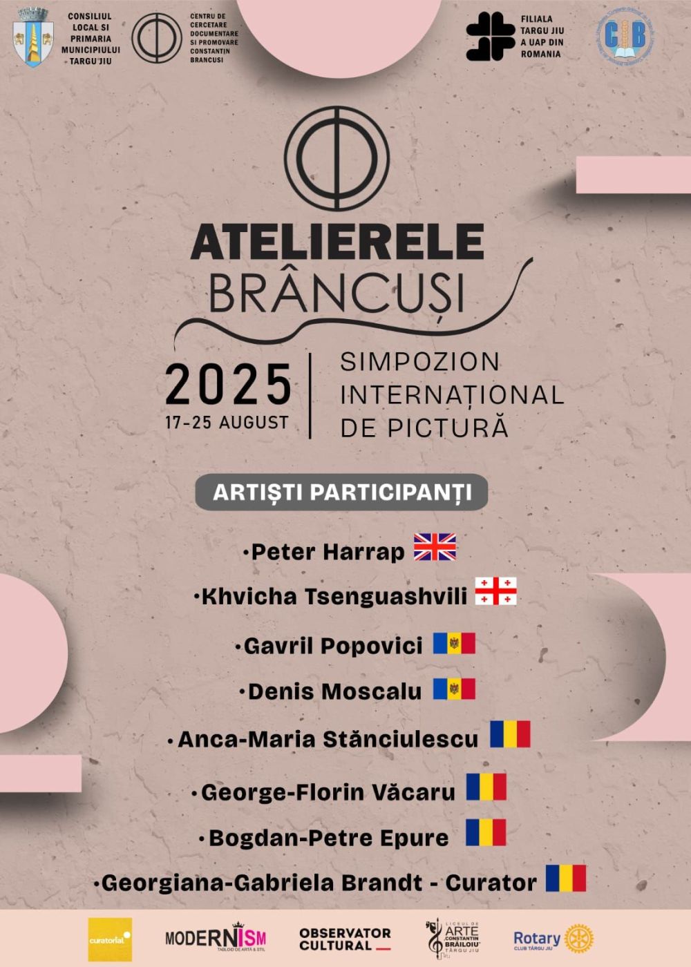Ediția din 2025, care se desfășoară până duminică, 24 august, reunește șapte artiști consacrați: Peter Harrap din Marea Britanie, Khvicha Tsenguashvili din Georgia, Denis Moscalu și Gavril Popovici din Republica Moldova, alături de Anca-Maria Stănciulescu, Bogdan-Petre Epure și George-Florin Văcaru din Gorj. Coordonarea artistică și selecția lucrărilor sunt asigurate de curatoarea Georgiana Brandt, care îi va însoți pe parcursul întregii tabere.