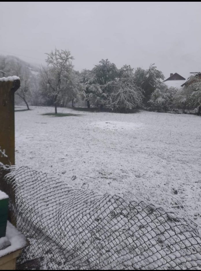 „Azi, 19 04 2022 Balcesti Gorj s-a depus strat de zăpadă peste pomi înfloriți, natura se răzbună după ce am defrisat pădurile”, transmite vicepreședintele PER Gorj, Ion Voicu