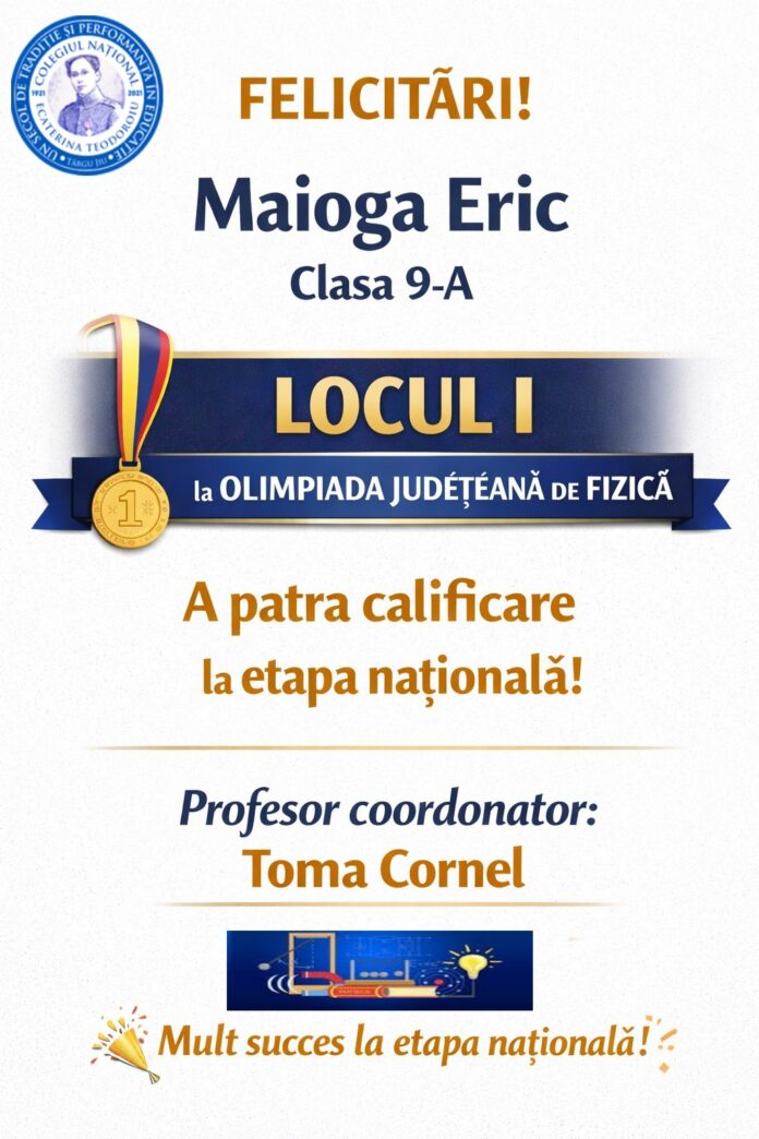 „Astăzi a început la Craiova Olimpiada Națională de Fizică, la care s-a calificat Eric Maioga, de pe locul I. Pentru Eric este a patra calificare la etapa națională a unei olimpiade anul acesta. O performanță extraordinară! Felicitări din suflet, Eric! Felicitări și domnului profesor Toma, care te-a pregătit. Mult succes la Craiova!”, au transmis ieri reprezentanții unității de învățământ.