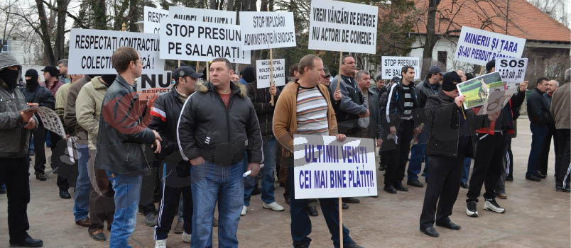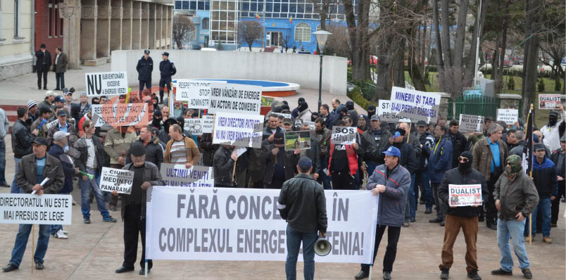 Sindicaliştii din Federaţia Naţională Mine Energie au pichetat din nou sediul Diviziei Miniere din Târgu Jiu, fiind a patra zi de proteste, din cele şase pentru care au primit aprobare. Circa 200 de angajaţi ai CE Oltenia au scandat „Cu Ciurel şi cu Răuţ am picat din lac în puţ”, „Minerii şi ţara şi-au pierdut răbdarea”, „Securistul bolşevic ne-a făcut salariul mic”, precum şi „Respectaţi Contractul Colectiv de Muncă” cu referire la managerul CEO şi cel de resurse