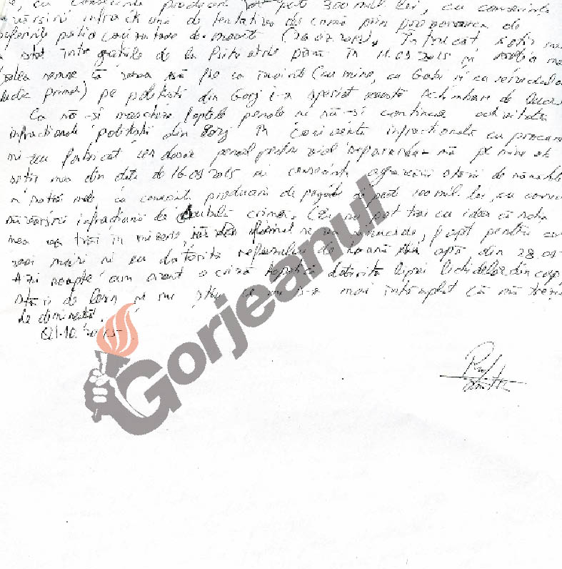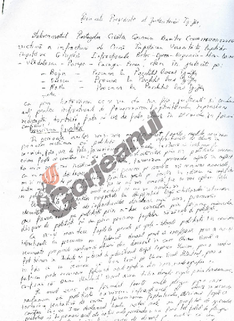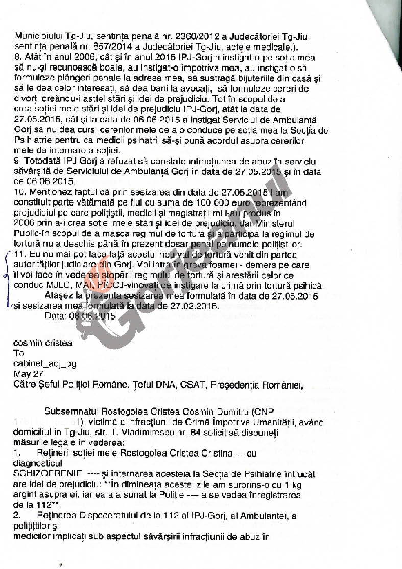 Cert este că într-un astfel de document, înregistrat pe 22 iunie 2015 la Parchetul de pe lângă Înalta Curte de Casaţie şi Justiţie, dar redactat în februarie a.c., Cosmin Rostogolea anunţa că vrea să-şi pună capăt zilelor, sătul că demersurile sale nu au avut nicio finalitate. “Eu nu mai pot face faţă acestui nou val de tortură, venit din partea autorităţilor judiciare din Gorj. Voi intra în greva foamei-demers pe care îl voi face în vederea stopării regimului de tortură şi arestării celor care conduc MJLC, MAI, PÎCCJ-vinovaţi la instigare la crimă prin tortură psihică. Ataşez la prezenta sesizare a mea formulată la data 27.05.2015 şi sesizarea mea formulată la 27.02.2015”, transmitea Cosmin Rostogolea.
