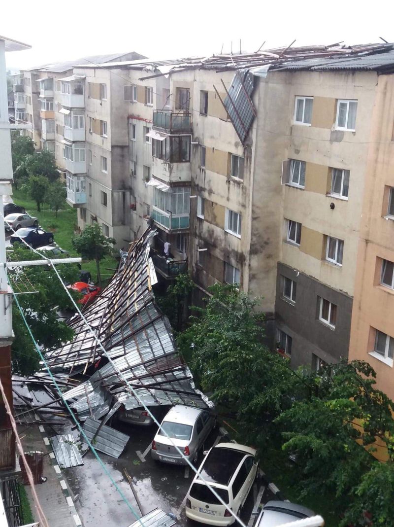 O furtună a făcut ravagii la Târgu-Cărbunești, ieri. Un acoperiş s-a desprins de pe un bloc din localitate, din cauza vântului puternic și a căzut pe patru mașini.