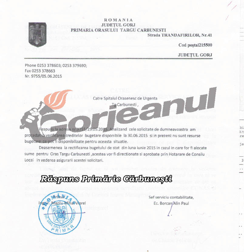 “Declaraţiile contradictorii ale programării spitalului în vederea acreditării de către CoNAS (care ar fi trebuit să se facă în trimestrul II din 2016), informarea superficială a opiniei publice, deoarece managerul spune în declaraţia făcută presei că programarea pentru acreditare este în august 2015) şi modul incorect prin care a abuzat de încrederea, serviciile şi disponibilitatea firmei noastre, sunt motive suficiente prin care d-nul manager al Spitalului Tg. Cărbuneşti va fi dat în judecată de către Lucas Consulting Partner Services SRL, pentru daune interese şi daune morale”, se mai arată în acelaşi document.