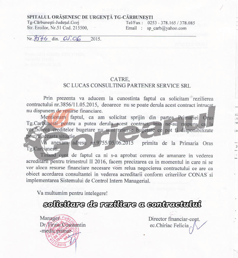Pentru a-şi demonstra corectitudinea şi intenţiile de a colabora şi a derula în bune condiţii contractul prezentat mai sus, firma pune la dispoziţia opiniei publice corespondenţa purtată cu Spitalul Târgu-Cărbuneşti cu societatea din Piteşti. “Acestea demonstrează reaua credinţă şi delăsarea managerului spitalului în întârzierea voită a derularii acestui contract, dar şi dezinteresul pentru un act de o importanţă vitală cum este acreditarea spitalului, fără de care, prin desfiinţarea lui ca unitate medicală, oamenii pot ajunge fără un loc de muncă, iar cetăţenii din Târgu-Cărbuneşti nu vor mai avea acces la serviciile medicale obligatorii”, mai spun cei de la Lucas Consulting Partner Services SRL.