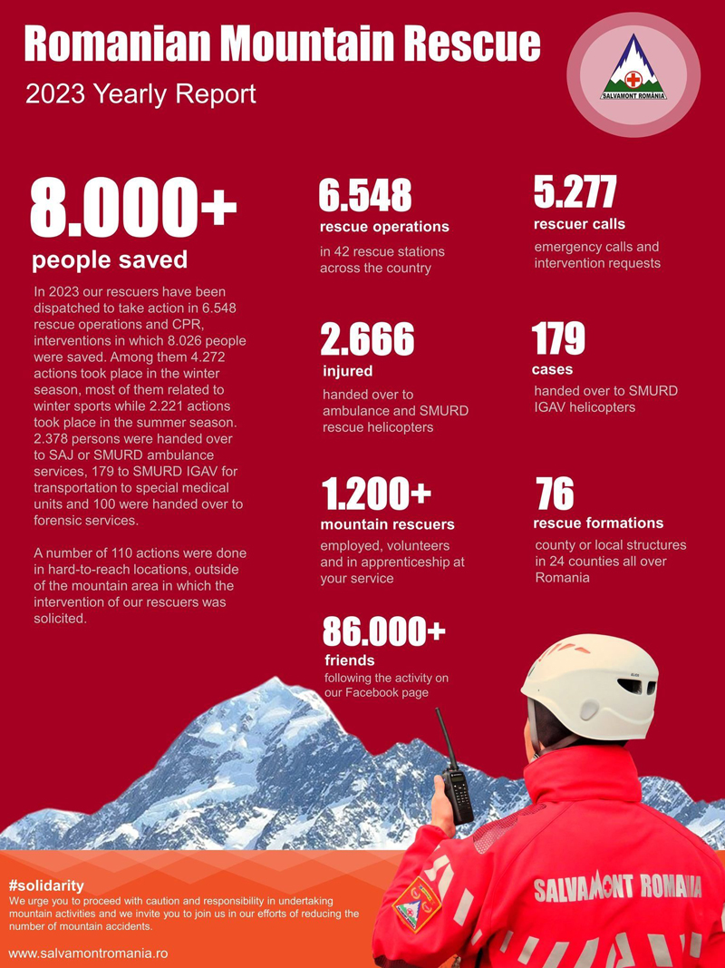 Astfel, ,,în ambele etape, iarnă și vară, de pregătire finală, organizate nivel național, modulul de formare și evaluare medicală a fost susținut cu lectori/formatori din cadrul sistemului de formare SMURD, urmărindu-se astfel continuarea uniformizării sistemului de pregătire și formare. În perioada de referință nu s-a reușit organizarea niciunei acțiuni de pregătire a salvatorilor montani pentru lucrul cu elicopterul la sol sau în aer. Pe linia pregătirii unităților canine Salvamont, a fost organizat stagiul național de formare și evaluare a unităților canine de avalanșă unde au fost brevetate patru noi unități de intervenție și reatestate 21 de tandemuri câine – salvator montan. În acest moment, la nivel național, sunt operaționale 25 unități canine de intervenție ce activează în structuri Salvamont din 14 județe, alte 4 unități canine de intervenție fiind la finalul pregătirii pentru obținerea brevetului. În anul 2023 unitățile canine Salvamont au participat la 48 de intervenții de căutare salvare pe timp de iarnă și de vară, dintre acestea 11 desfășurându-se în afara zonei montane”, informează serviciul public. Alte informații din bilanțul anului 2023, mai jos.