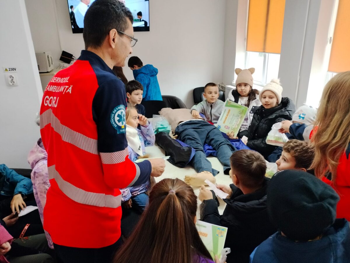 Ulterior, elevii clasei a II-a D din cadrul Școlii Gimnaziale „Constantin Săvoiu”, însoțiți de înv. Dragoș Giorgi, au susținut un moment de colinde și au participat la o scurtă prezentare privind activitatea Serviciului Județean de Ambulanță.
