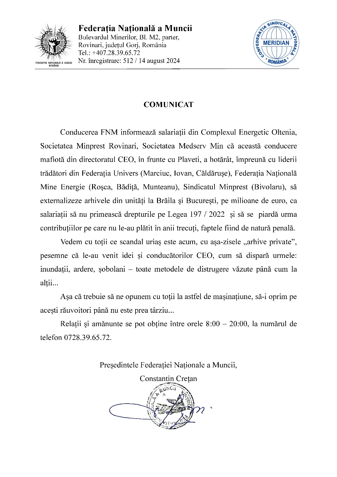 Liderul Federației Naționale a Muncii a anunțat astăzi că șefii CEO vor externaliza arhivele care conțin documentele salariaților companiei. În opinia lui Constantin Crețan, conducerea CEO este una mafiotă care acționează în acest fel pentru ca salariații Complexului Energetic Oltenia să nu mai poată beneficia de Legea 197.