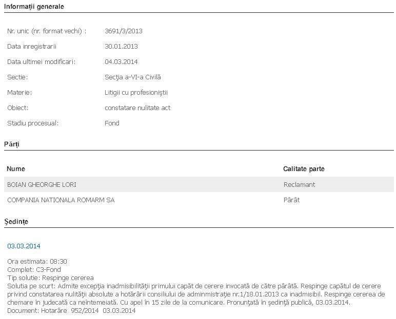 Tribunalul Bucureşti se pronunţă pe 3 martie în legătură cu pretenţiile lui Boian, căruia nu îi dau însă dreptate. Instanţa respinge astfel cererea lui Boian, dar admite excepţia inadmisibilităţii primului capăt de cerere invocată de către pârâtă. “Respinge capătul de cerere privind constatarea nulităţii absolute a hotărârii consiliului de administraţie nr.1/18.01.2013 ca inadmisibil. Respinge cererea de chemare în judecată ca neîntemeiată. Cu apel în 15 zile de la comunicare”, se arată în soluţia instanţei bucureştene.