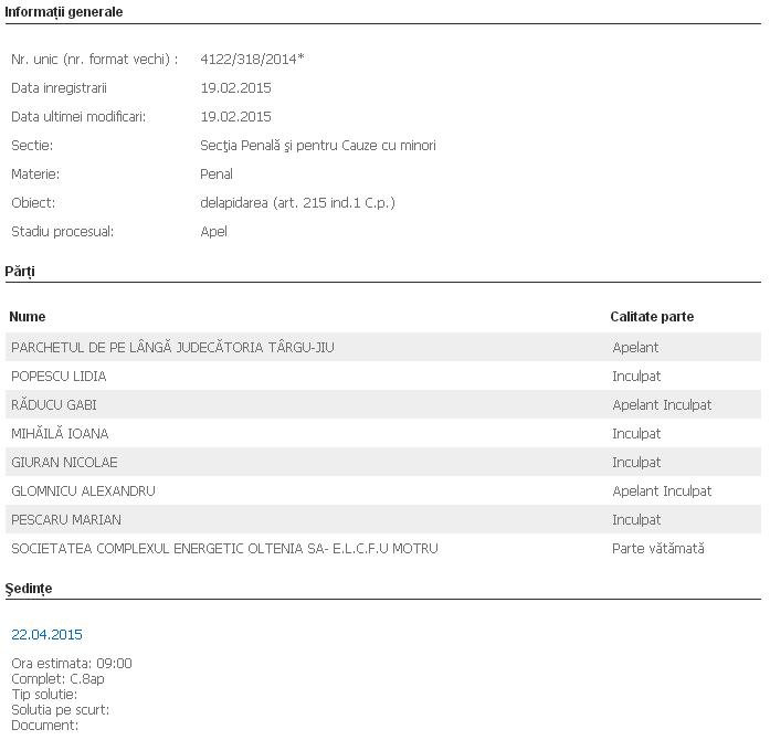 La jumătatea lunii trecute Judecătoria Târgu-Jiu i-a achitat pe cei foşti şefi în cadrul Exploatării de Livrări Căi Ferate Uzinale (ELCFU) Motru, subunitate a CE Oltenia şi pe unul dintre liderii de sindicat din cadrul acesteia în dosarul de delapidare ajuns pe rolul instanţei pe 5 ianuarie 2015. Deşi, majoritatea inculpaţilor au fost achitaţi primind amenzi administrative, doi dintre aceştia, mai precis Alexandru Glomnicu şi Gabi Răducu au făcut apel dorind să rămână astfel chiar şi fără sancţiunea primită. Dosarul s-a înregistrat pe rolul instanţei din Craiova pe 19 februarie 2015 şi va avea primul termen abia după sărbătorile pascale.