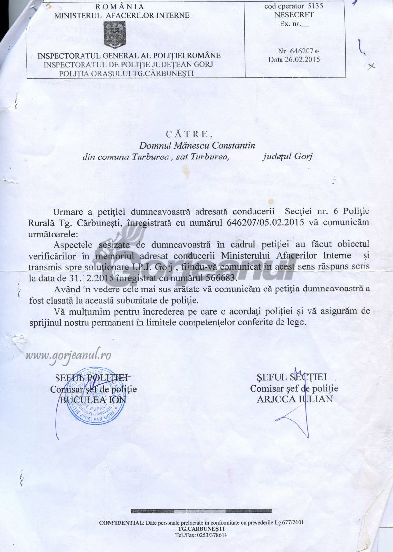 În această petiție, subofițerul din Turburea este acuzat tot de abuz în serviciu, legat tot de furt de lemne din pădurea cetățeanului reclamant. Până în prezent, reclamatul nu a fost chemat la Parchetul Cărbunești pentru audieri.