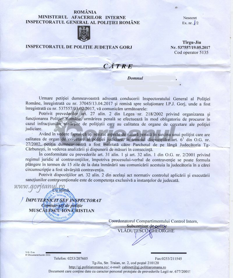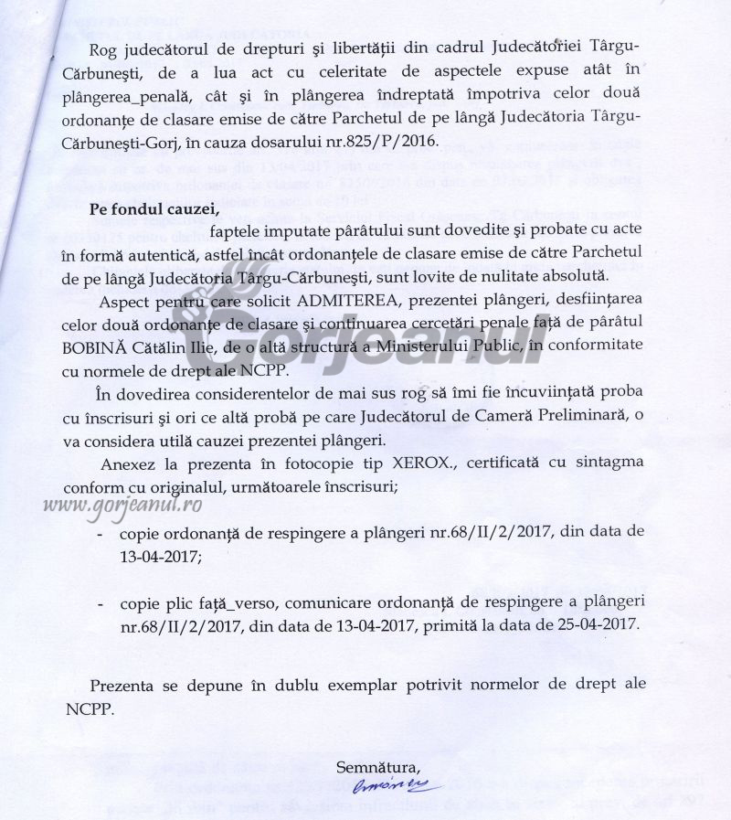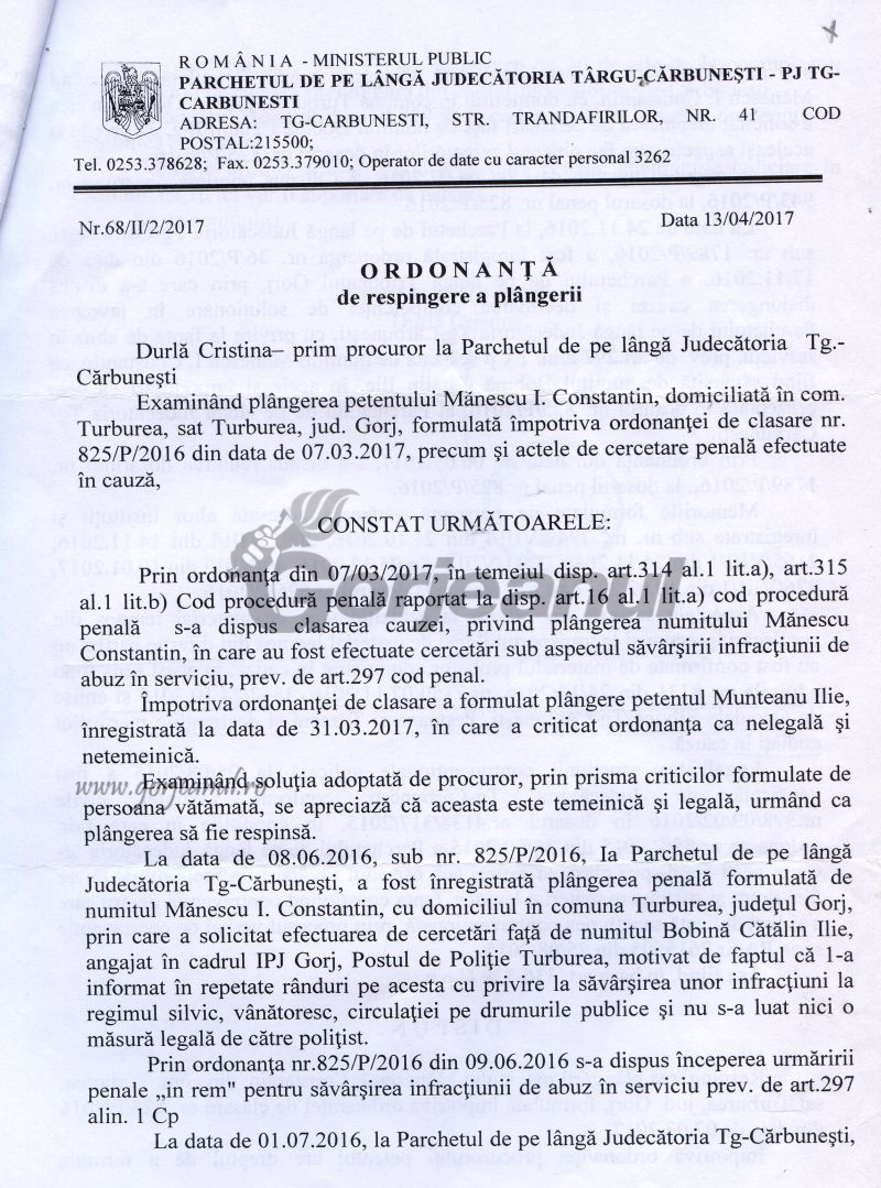 Ordonanța de clasare pe care am primit-o în luna aprilie am atacat-o la instanța Judecătoriei Târgu-Cărbunești, unde a rămas în pronunțare.
