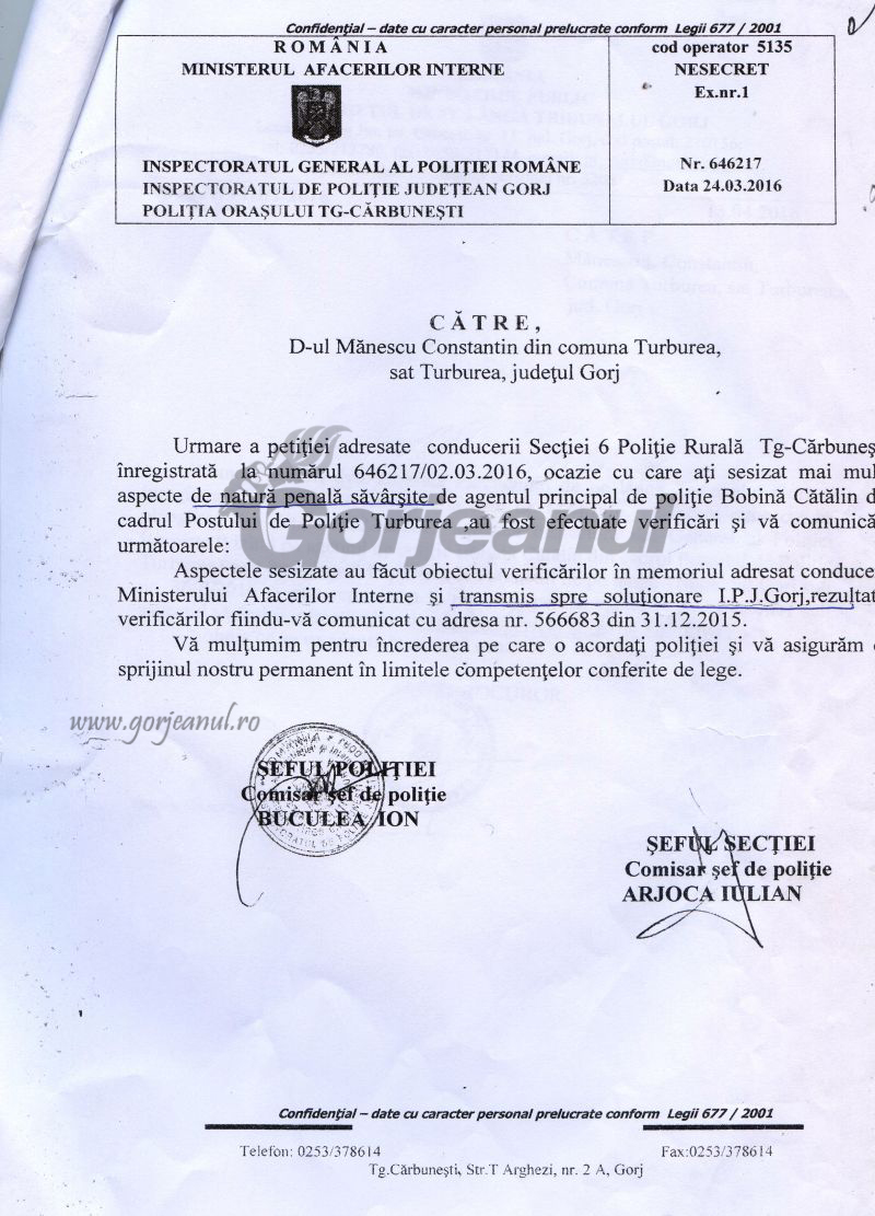 Un alt cetățean al comunei Turburea a reclamat și el, în luna aprilie 2017, la Inspectoratul General al Poliției, faptele polițistului Bobină, săvârșite pe raza acestei localități. Răspunsul IPJ Gorj a fost că, urmărirea penală trebuie efectuată de un procuror pentru această infracțiune reclamată pentru un polițist, drept urmare petiția cu nr. 37045 din 13.04.2017 a fost înaintată Parchetului de pe lângă Judecătoria Târgu-Cărbunești, în vederea analizării și dispunerii de măsuri în consecință.