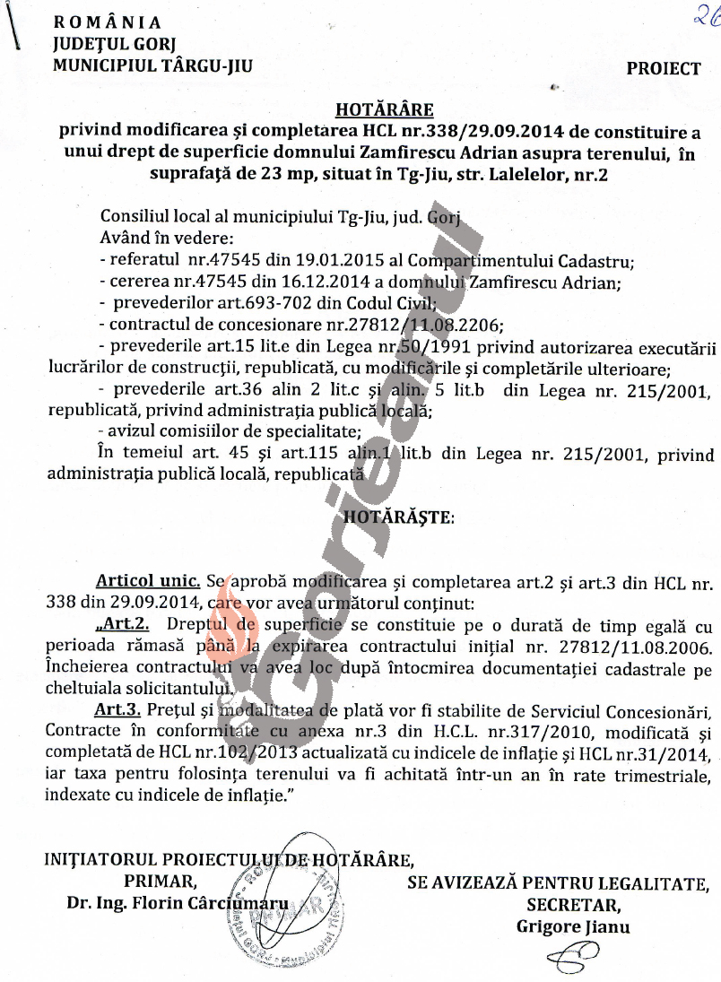 Adrian Zamfirescu, fostul şef al Corpului de Control al Sucursalei Divizia Minieră a CEO, din iunie 2013 administrator special al Uzinei Mecanice(UM) Sadu, s-a adresat, în scris, anul trecut, Consiliului Municipal Târgu-Jiu, pentru obţinerea dreptului de superficie a unei suprefeţe mai mici de teren, situate chiar lângă proprietatea pe care a deţinut-o împreună cu fosta soţie, în municipiu. De altfel, vila foştilor soţi Zamfirescu a fost împărţită, cu doi ani în urmă, la partaj, concesiunea pentru terenul de 250 de mp rămânându-i de plătit administratorului de la Bumbeşti-Jiu. Zamfirescu nu s-a mulţumit cu terenul în cauză deoarece şi-a extins proprietatea cu încă 23 de metri pătraţi, pe un teren al Primăriei Târgu-Jiu pentru care a primit în toamna anului trecut drept de superficie pentru 49 de ani. Ieri a cerut şi i s-a aprobat însă limitarea dreptului în cauză, pe motiv că primul teren a primit un contract similar în 2006.