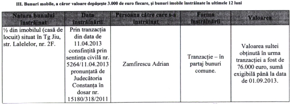 Mai exact, potrivit declaraţiei de avere a magistratului, Elena Gheju a fost de acord să primească de la fostul soţ 76.000 de euro, parte din locuinţa construită pe timpul căsătoriei. Gheju îi dăduse termen lui Adrian Zamfirescu să-i dea banii în cauză până în luna septembrie a anului respectiv. Aşa aceasta a renunţat la partea ei din locuinţă, magistratul mai deţinând, în prezent, doar o parte din apartamentul cumpărat împreună cu fiul ei.