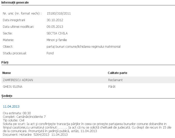 O lună mai târziu partajul a rămas în pronunţare, fiind dată sentinţa Judecătoriei Constanţa pe 11 aprilie 2013, instanţa consfiinţind înţelegerea de împărţire a bunurilor între cei doi foşti soţi. Ambii au ales astfel, în final, să îşi împartă, prin înţelegere, averea dobândită în timpul căsătoriei.