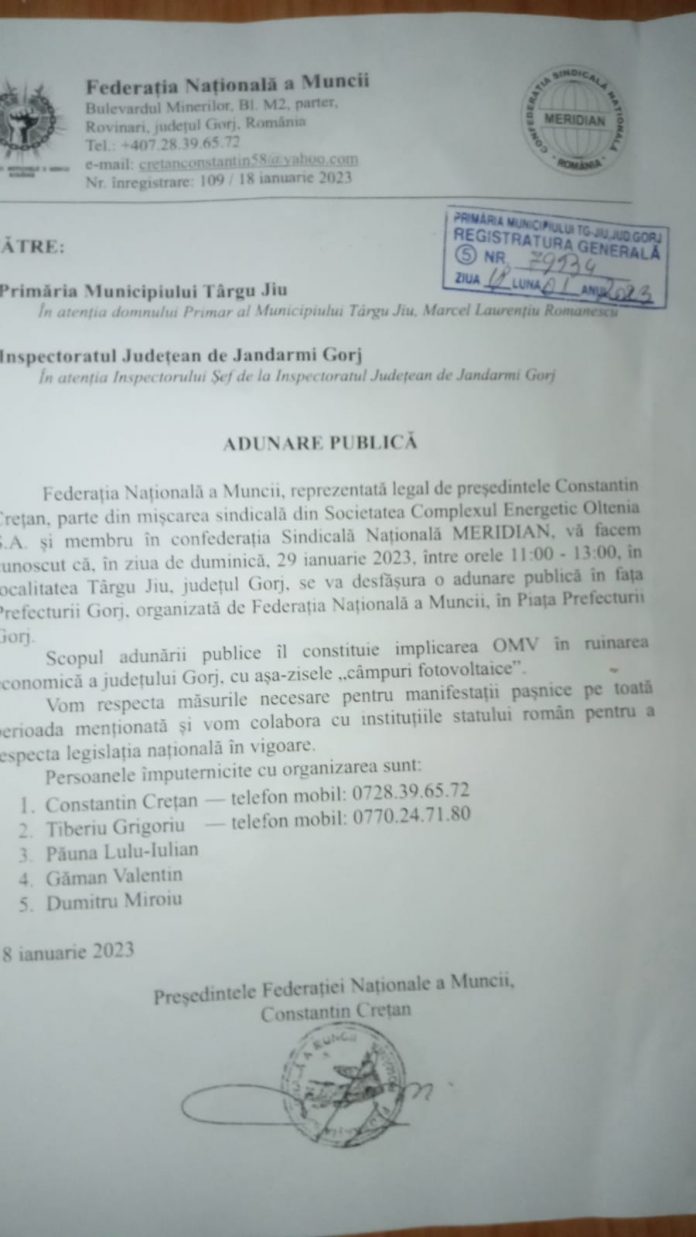 Liderul Federației Naționale a Muncii, Constantin Crețan, a anunțat că duminică, între orele 11.00 și 13.00, va avea loc o adunare publică al cărei scop este protestul împotriva OMV Petrom care ”s-a implicat în ruinarea economică a județului Gorj”, prin afacerea austriecilor cu CEO în care se vor realiza parcuri fotovoltaice pe terenurile care au fost exploatate de carierele miniere. Constantin Crețan a declarat în mai multe rânduri că suprafețele pe care au pus ochii cei de la OMV Petrom sunt ale oamenilor din zonă.