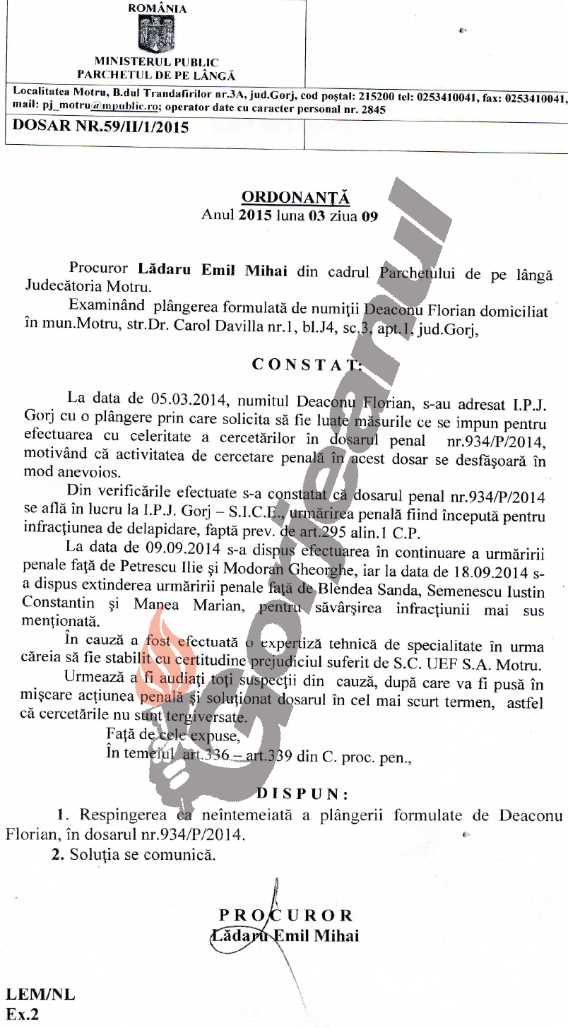 “La data de 9.09.2014 s-a dispus efectuarea în continuare a urmăririi penale faţă de Ilie Petrescu şi Modoran Gheorghe, iar de la data de 18.09 2014 s-a dispus extinderea urmăririi penale faţă de Blendea Sanda, Semenescu Iustin Constantin şi Manea Marian, pentru săvârşirea infracţiunii mai sus menţionate. În cauză a fost efectuată şi o expertiză tehnică de specialitate în urma căreia să fie stabilit cu certitudine prejudiciul suferit de SC UEF SA Motru. Urmează să fie audiaţi toţi suspecţii din cauză, după care va fi pusă în mişcare acţiunea penală şi soluţionat dosarul în cel mai scurt termen, astfel că cercetările nu sunt tergiversate”, se scuza procurorul de caz Lădaru, în momentul în care a fost sesizat în martie 2015 că cercetările din dosar, efectuate la IPJ Gorj ar fi întârziate.