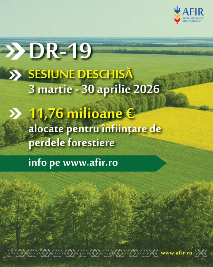 Agenția pentru Finanțarea Investițiilor Rurale dă startul, azi, 3 martie 2026, sesiunii de depunere a cererilor de finanțare pentru intervenția DR-19 – „Investiții neproductive la nivel de fermă”, prin care fermierii pot obține până la 200.000 de euro pentru înființarea perdelelor naturale de protecție a culturilor agricole.