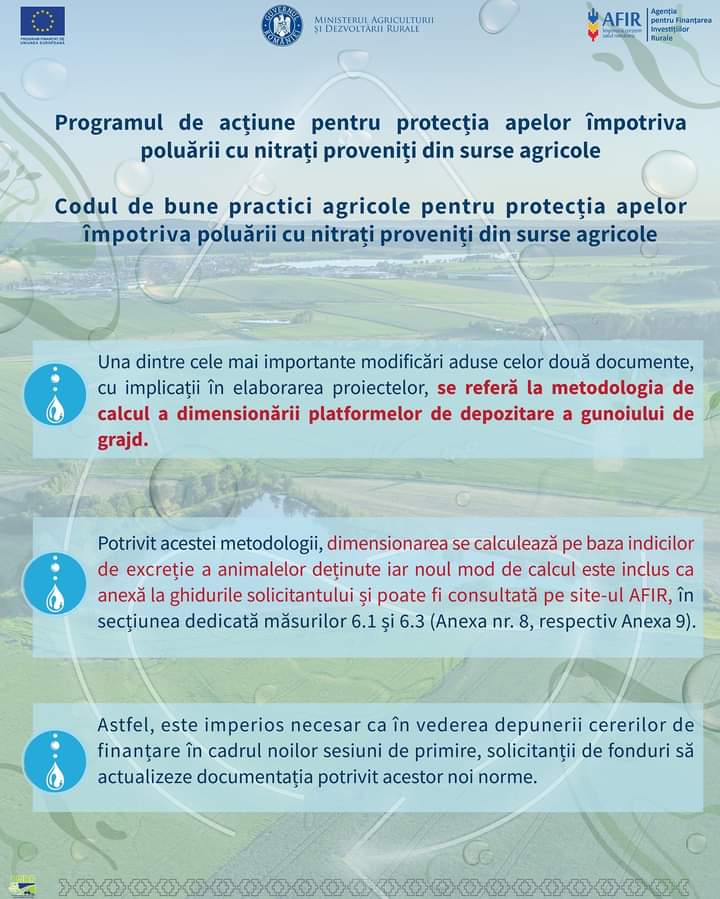 „Programul de acţiune pune în aplicare măsurile obligatorii prevăzute în anexa nr. 4 din HG nr. 964/ 2000 privind aprobarea Planului de Acţiune pentru protecţia apelor împotriva poluării cu nitraţi proveniţi din surse agricole, cu modificările şi completările ulterioare şi măsurile stabilite în Codul de Bune Practici Agricole elaborat în conformitate cu Directiva Nitraţi (DIRECTIVA CONSILIULUI 91/676/CEE din 12 decembrie 1991 privind protecţia apelor împotriva poluării cu nitraţi proveniţi din surse agricole). Totodată, prevederile Programului de acţiune sunt obligatorii pentru toţi fermierii care deţin sau administrează exploataţii agricole şi pentru autorităţile administraţiei publice locale ale comunelor, oraşelor şi municipiilor pe teritoriul cărora există exploataţii agricole. Codul de bune practici agricole este un document cu caracter voluntar, care conţine şi exemple de bune practici care exced măsurile obligatorii cu rol de prevenire şi reducere a poluării cu nitraţi din surse agricole. Una dintre cele mai importante modificări aduse celor două documente, cu implicaţii în elaborarea proiectelor, se referă la metodologia de calcul a dimensionării platformelor de depozitare a gunoiului de grajd. Potrivit acestei metodologii, dimensionarea se calculează pe baza indicilor de excreţie a animalelor deţinute, iar noul mod de calcul este inclus ca anexă la ghidurile solicitantului şi poate fi consultată pe site-ul AFIR, în secţiunea dedicată măsurilor 6.1 şi 6.3 (Anexa nr. 8, respectiv Anexa 9). Astfel, este imperios necesar ca în vederea depunerii cererilor de finanţare în cadrul noilor sesiuni de primire, solicitanţii de fonduri să actualizeze documentaţia potrivit acestor noi norme”, a anunțat AFIR.