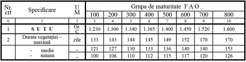 În funcție de această sumă se procedează la alegerea grupei F A O potrivită pentru zonă și în cadrul ei hibrizii în funcție și de alte criterii. Redăm în continuare clasificarea hibrizilor de porumb în grupele de maturitate F A O unde S U T U = Suma Unităților Termice Utile. F A O este Organizația Mondială pentru Agricultură și Alimentație, Food and Agricultural Organization, autoritatea mondială în domeniu. Aceste grupe sunt general valabile și este bine să ținem și noi cont de acestea dacă dorin să nu aruncăm banii și munca “pe apa Sâmbetei”.