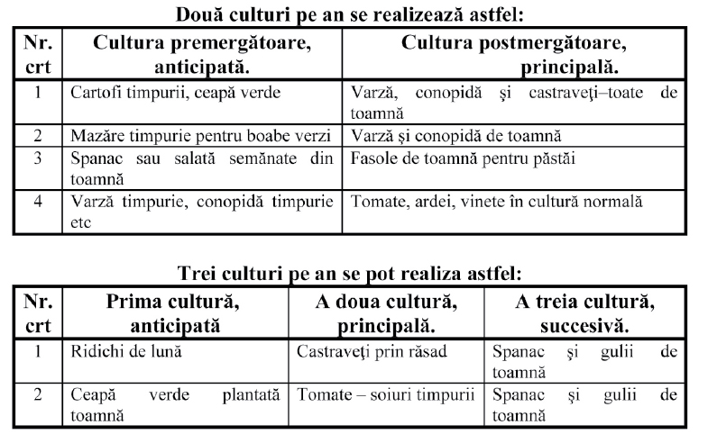 În legumicultură se pot obţine şi 2 – 3 culturi pe an în aceeaşi parcelă, prin culturi anticipate și succesive. Astfel nu numai că se face economie de spațiu, suprafață, dar se asigură și o mai bună întreținere a culturilor.