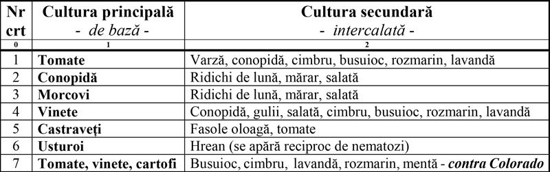 O situație total neplăcută o constituie abundența de miriapozi și viermi de toate modele în sol, care pot chiar compromite total recoltele. Pentru alungarea miriapozilor și a viermilor din sol, chiar și a viermilor sârmă, introduceți în asolament o solă de fertilizanți verzi care să revină după 4, 6 sau 8 ani și cultivați pe ea secară pe care să o cosiți în faza de burduf și să o încorporați imediat în sol prin arătură. Faceți aceasta cel puțin de două ori pe an în sola respectivă și vă creșteți șansa de alungare a viermilor din sol. În grădina de legume o puteți asocia cu împrejmuirea fiecărei sole cu un rând de hrean și / sau crăițe – Tagetes sp. – și efectul poate fi garantat. Un alt mijloc de protecție fără costuri a legumelor îl constituie asocierea, intercalarea culturilor, astfel că acestea se protejează reciproc unele pe altele, mai ales contra dăunătorilor. Redăm în tabelul de mai jos un model de asociere, cu precizarea că această asociere se practica la noi „din negura vremilor”, fără explicații științifice, dar cu efecte majore în protejarea ecologică a recoltelor.