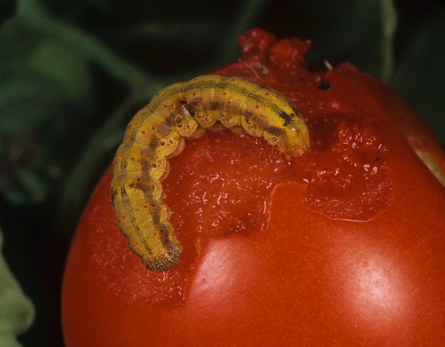 Tomato Fruitworm (Helicoverpa armigera) caterpillar colored orange from feeding on a Tomato fruit4 – Omida fructelor (Heliotis armigera) are 2 – 3 generații pe an și iernează în sol ca pupă. Adulții – fluturii – au 30 – 40 mm amvergură și sunt noctuizi (zboară numai noaptea), depun ouă pe frunzele și florile de tomate și ardei, iar larvele de culoare variabilă, de la verde-gălbui la brun inchis cu trei dungi de culoare deschisă pe spate,  pătrund în fructe  pe care le compromit total. Tratamentul este același cu cel pentru combaterea gândacului din Colorado.