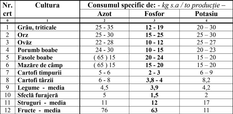 Realizarea unor producții agricole vegetale mulțumitoare nu se poate face fără aport extern de substanțe nutritive, fie ele sub formă de gunoi de grajd bine compostat, fie sub formă de fertilizanți chimici. Acestea din urmă se aplică etapizat, începând cu aplicarea de bază, la pregătirea patului germinativ și continuând cu cele faziale, după răsărirea plantelor de cultură. Pentru producerea unei tone de producție principală, împreună cu producția secundară aferentă acesteia, culturile agricole extrag din sol cantități însemnate de substanțe chimice denumite elemente nutritive. Redăm în tabelul de mai jos consumurile specifice de elemente nutritive pentru principalele culturi agricole specifice Gorjului.